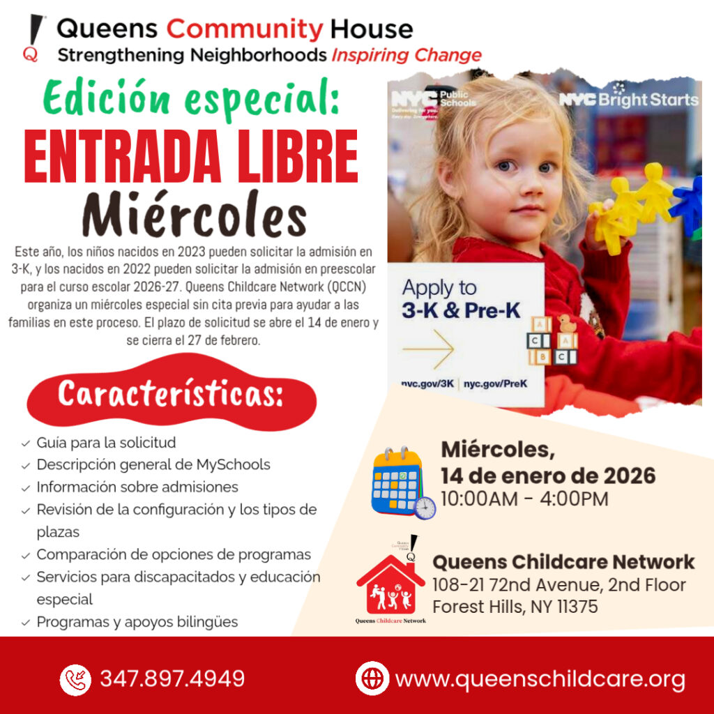 A lo largo de este mes, la QCCN ha ofrecido asistencia específica a las familias que solicitan NYC 3-K Pre-K para el próximo curso escolar. Las familias recibieron orientación paso a paso sobre la solicitud, una visión general de la MySchools de admisión y los tipos de plazas, ayuda para comparar las opciones de programas e información sobre los programas bilingües y los servicios de educación especial. Estas sesiones garantizaron que los padres pudieran navegar eficazmente por el proceso de solicitud antes de la Fecha límite: 27 de febrero.